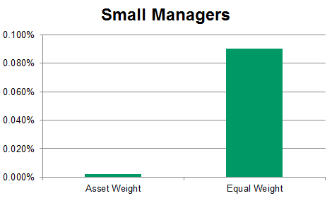 The following charts show just how differently a manager’s performance affects index performance under both methods. In the case of this index, the ten smallest funds are all the same size so the gap in effect is the same.