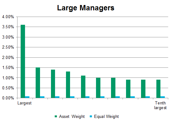 The weightings of the most important constituents in the S&P 500 decrease by a factor of 11 when an equally weighted construct is employed. When “everyone owns Apple,” it would be silly to assess market returns by affording Apple the same weight as PulteGroup. Yet, that is just what most hedge fund indices do. In an equally weighted hedge fund index, the returns of a $50 billion fund carry the same weight as a $50 million fund.