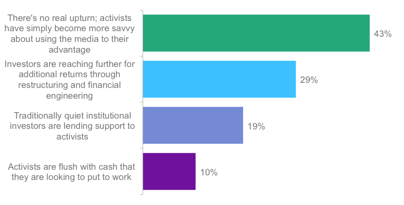 Nearly 29% of respondents believe the upturn in activism is mostly indicative of investors’ reaching for additional returns through restructuring and financial engineering, whereas 19% think newfound support from traditionally quiet institutional investors, including pension funds and mutual fund managers, has strengthened the hand of activists and is the primary reason behind the increase. With companies flush with cash and interest rates near record lows, it’s not surprising that activists and pension funds are joining forces.