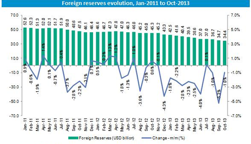 As mentioned in the previous section, since October 2011, the government has had an active role in controlling the exchange rate fluctuations. This involvement was a consequence of the continuous drain of foreign reserves, which was caused by a decrease in the trade balance surplus and an increase in capital flight. After reaching a maximum level in January 2011, foreign reserves have been falling continuously. In addition, the two months before the restrictions on US dollar demand were put into effect had the biggest decreases in the reserves (3.7% in August and 2.8% in September).