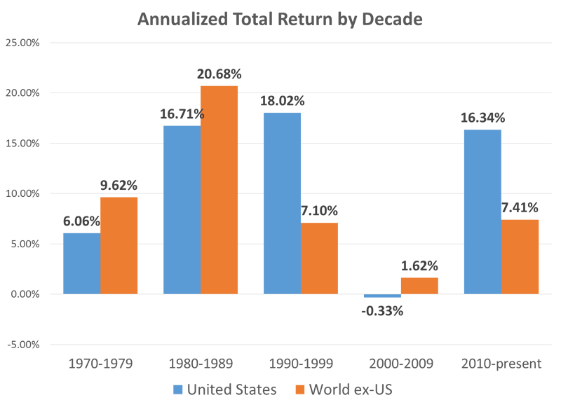 The dataset for the MSCI World ex-US Index goes back to 1970. If you break out annualized returns by decade, you can see that periods of outperformance and underperformance for global equities have always been part of the deal.