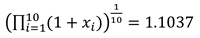 As we discussed in the section above, the geometric mean is the average to use on a product. So, the geometric mean of the returns xi over 10 years is