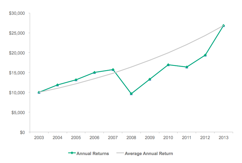 or a 10.37% annualized return, which matches what we were given in the table! With this value, we can calculate the ending value directly: $10,000 * 1.1037^10 = $26,828. The average annual return also lets us calculate the value for the intermediate years, as if there was an investment that earned exactly the average annual return every year. This is plotted below, showing a smooth curve that starts and ends at the same points.