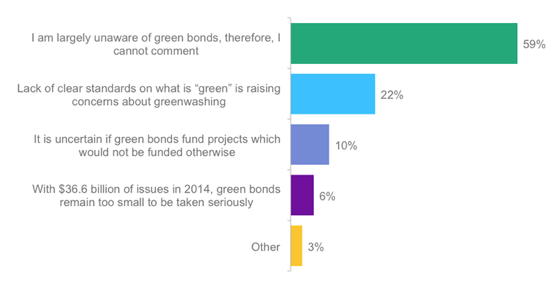 To get a feel for opinion of investment professionals about green bonds, we asked CFA Institute Financial NewsBrief readers for their take on the principal challenge facing this market. A clear majority, just about 60% of the 465 respondents, indicated that they are unaware of green bonds. Concerns about authenticity and additionality came in a distant second (22%) and third (10%), respectively.