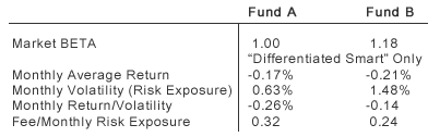 In order to properly address this fundamental question of value, we need to focus on the differentiated smart risk exposure, figure out the amount of that risk exposure, and calculate a fee per unit of differentiated smart risk exposure (i.e., fee per unit volatility). Assuming similar quality (i.e., similar return per unit of risk), the fee per unit of differentiated smart risk exposure is the key metric of value.