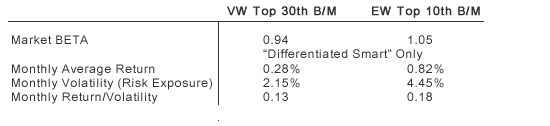 The table below reports the main results. First, both smart beta strategies have a BETA close to 1. Second, the equal weight top 10th percentile B/M strategy has more than double the differentiated smart risk exposure (volatility) when compared to the value weight top 30th percentile B/M strategy.