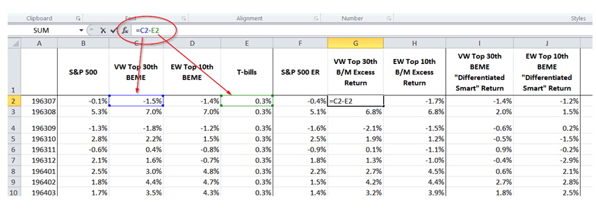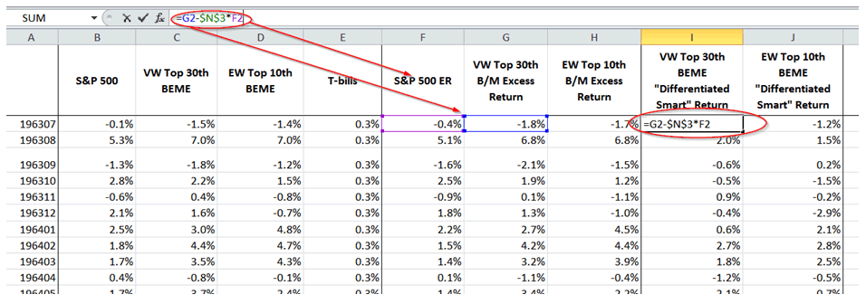 4. The manager’s historical differentiated smart return component is obtained by netting out — subtracting — the S&P 500 return component, which is BETA*S&P 500 Excess Return. In other words, DIFFERENTIATED SMART RETURN = MANAGER’S EXCESS RETURN – BETA*S&P 500 EXCESS RETURN. Do this calculation for each holding period.