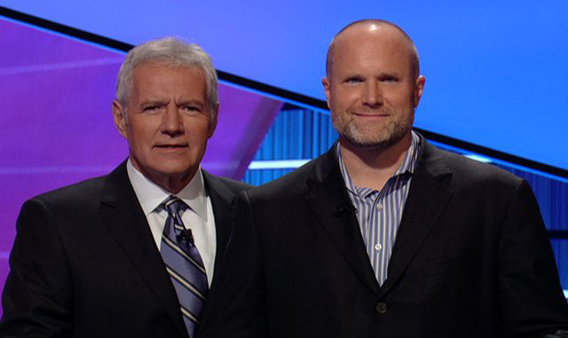 The author (r) during his first and only appearance on Jeopardy! with long-time host Alex Trebek. Courtesy of Duncan Stewart, CFA.