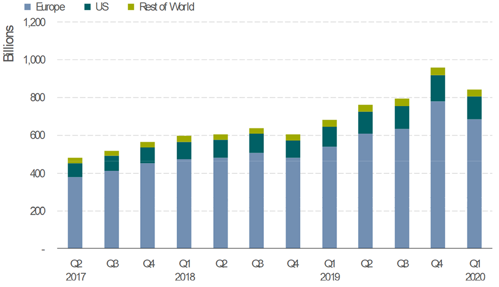Investor preference for passive, index-tracking strategies has carried over to ESG. This trend has been most pronounced in the United States, where index funds and and ETFs captured 80% of sustainable flows in the first quarter of 2020, up from 60% in 2019.