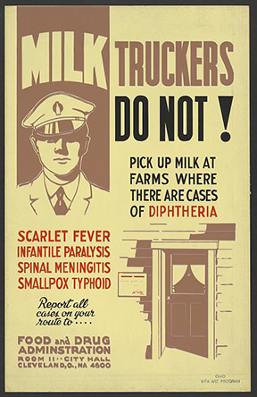 The accompanying graphic shows a 1937 public health poster from that archetypal First World country, the United States. The milk truckers who transported milk from the dairy farmers to consumers were exhorted not only to avoid people who were suffering from diphtheria, smallpox, and a long list of other diseases, but to report them.