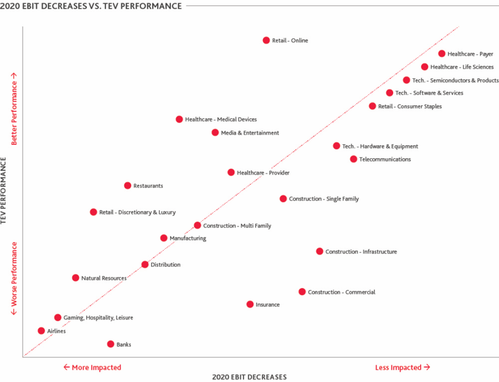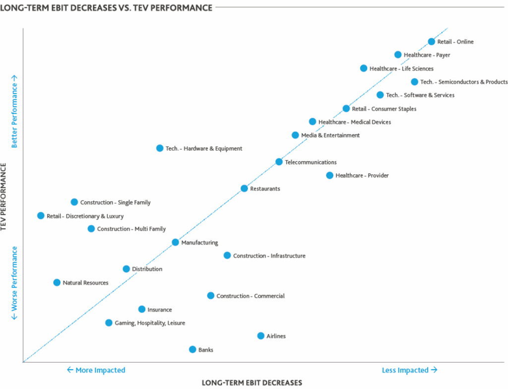 In the study, the team analyzed the correlations on a relative basis for each industry by plotting their relative TEV change against relative changes in both 2020 EBIT and long-term EBIT. Plots above the line represent industries where the TEV performance was better than the relative decrease in corresponding EBIT: Market value performed better than analyst estimates would suggest compared to other sectors.