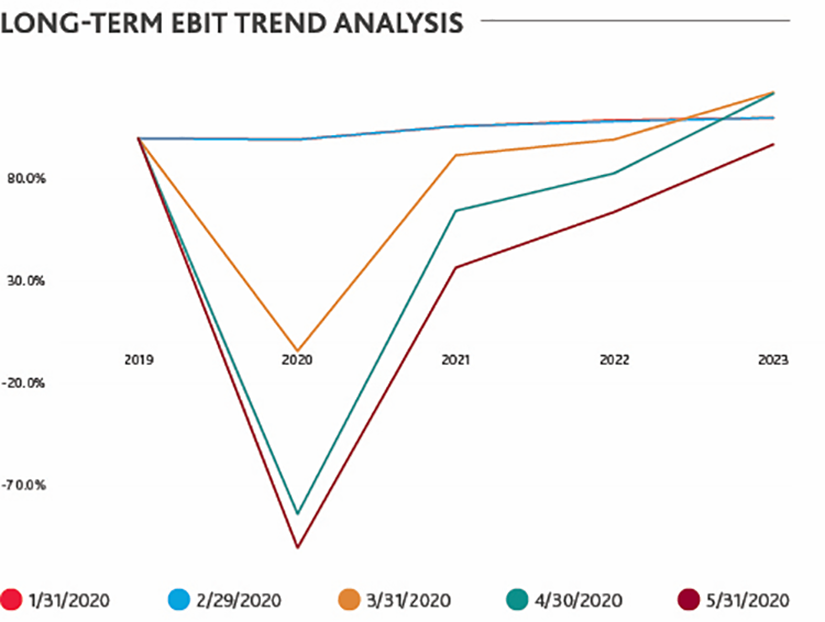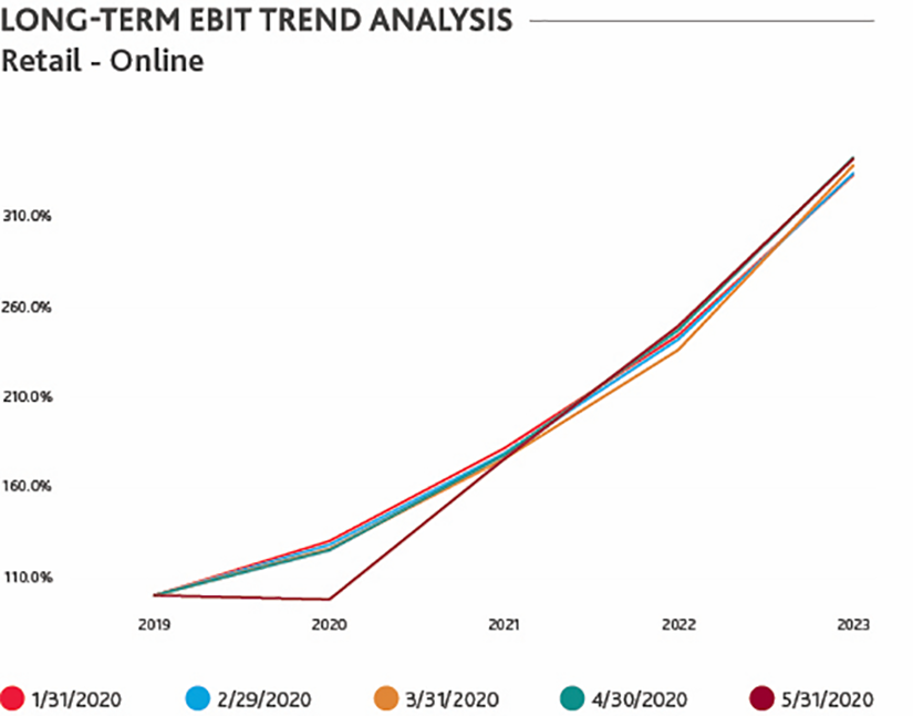 The “Trend Analysis” graphs include the aggregate EBIT estimate for sector companies at the end of each month from 31 January to 31 May. The estimates extend out for each future period in which meaningful data is available. The aggregate estimates for each year (and at each point in time) are common sized to the actual aggregate 2019 result. For example, a 2020 estimate of 110% indicates 10% expected industry growth, while a 90% estimate indicates a 10% expected decline. These graphs show a time lapse of the movement in estimates and indicate how both the near-term impact as well as the path toward recovery have changed since the onset of the economic crisis.