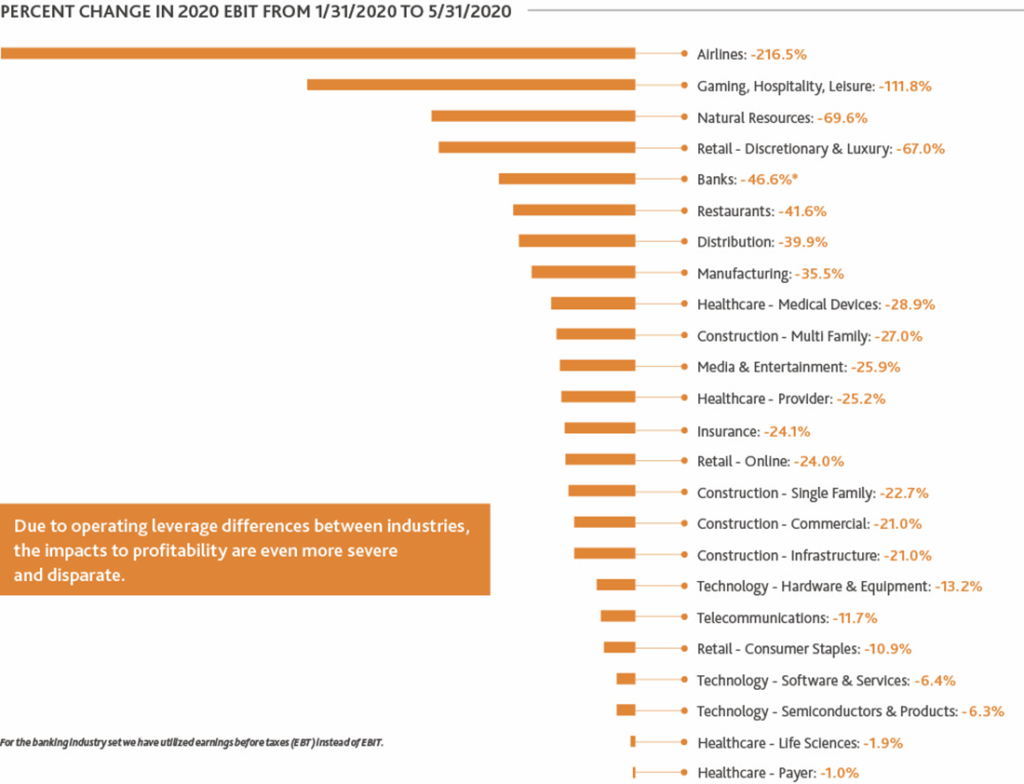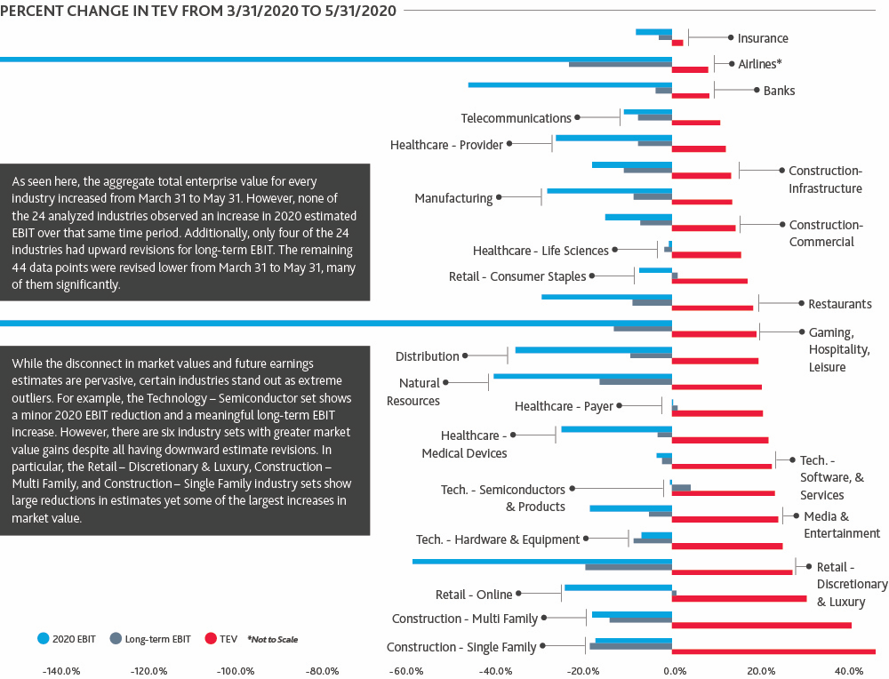 Despite the near universal decline in forecasted fundamentals, equity markets have gone in a different direction. The chart below illustrates the change in aggregate total enterprise value (TEV) for each industry from 31 January 2020 to 31 May 2020, using market capitalization for the banking sector.