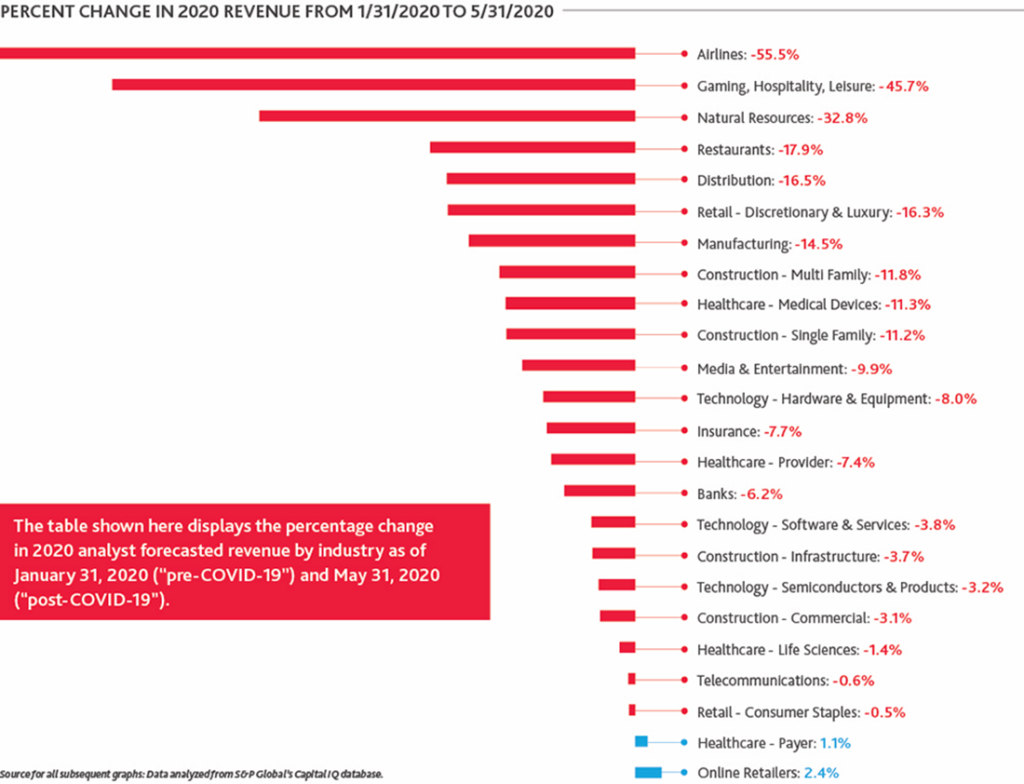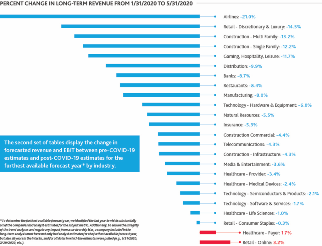 The analysis revealed stark sector differences in near-term effects and the timing and depth of a recovery. Although declines in expected revenues and profits for specific industries are no surprise, their magnitude and long-term ramifications, as conveyed by analyst estimates, are severe. The tables below, based on data from S&P Global’s Capital IQ database, display both near-term and long-term changes in estimated revenue and EBIT by sector.