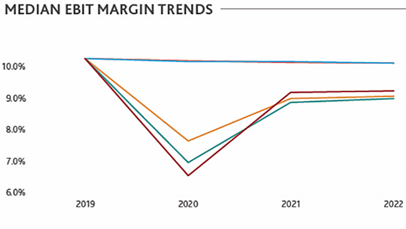 Plots below the line, on the other hand, indicate industries where TEV performance was worse than the relative decrease in corresponding EBIT. Market value performed worse than analyst estimates anticipated. Plots close to or on the trend line had TEV performance consistent with the relative movement in corresponding EBIT. Relative to other industries, market value performed as expected based on changes to estimates.