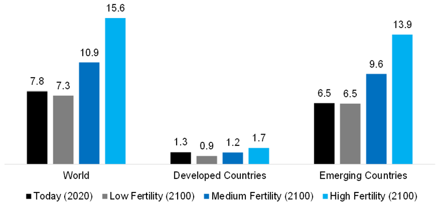 Today’s global population is 7.8 billion and is expected to grow by 40%, to 10.9 billion, by 2100. Of course, this outcome depends on which of the potential fertility rate scenarios forecast by the UN materializes. The populations of developed nations are only predicted to grow amid a high fertility rate environment. Failing that, growth is expected to be confined to emerging markets.
