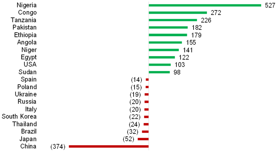 Top 10 Population Gains and Losses by Country (in Millions): 2020 to 2100