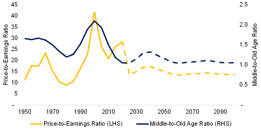 Line chart depicting Price-to-Earnings and Middle-to-Old Age Ratios in the United States