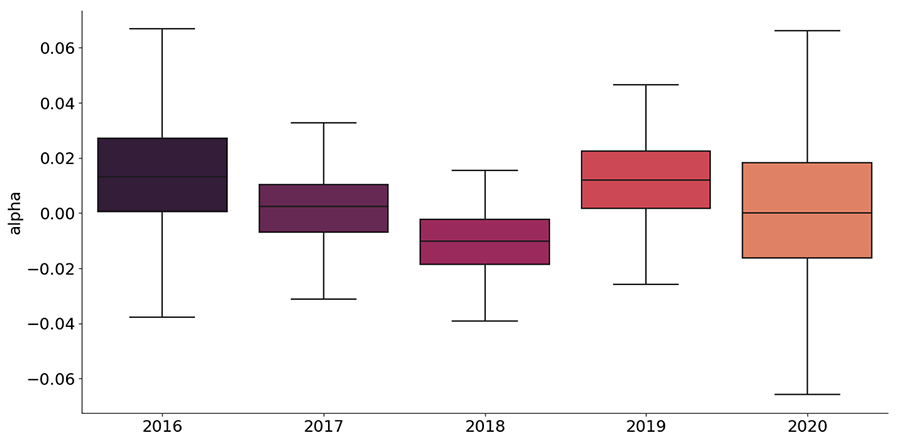 Further, the dynamics of alpha generation over time shows a recurring pattern: The vast majority of funds record good and bad years in tandem. For example: 75% of our identified fund universe underperformed an equivalent ETF-based strategy in 2018, while 75% outperformed the year after. This is not consistent with the concept of alpha and suggests either a common factor is missing from the ETF sample or a high correlation among timing and credit selection bets across active managers.