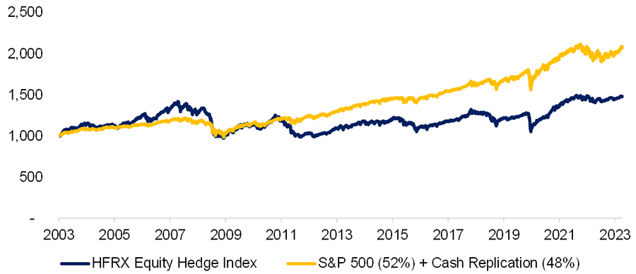 The HFRX Equity Hedge Index’s volatility was 6.1% over the 2003 to 2023 period, which we could have replicated with a 52% allocation to the S&P 500 and 49% to cash. But the replication portfolio’s CAGR would have been 3.7% compared with 2.0% for the hedge funds, and the drawdown would have fallen from 31% to 19%. This results in significantly higher risk-adjusted returns for the replication portfolio.