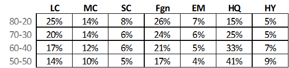 - Strategies range from 50-50 to 80-20 mixes of equity and bonds