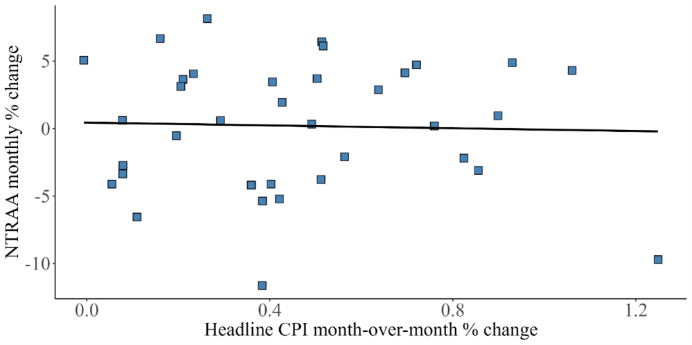 But it’s the actual values, not hypothesis testing, that are of interest. The returns of broad, real-assets benchmarks did not move in the same direction as inflation from 2021 to 2023.