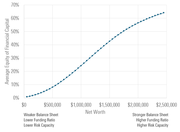 In Figure 1, each dot is the average equity level of financial capital from 180 net worth optimizations corresponding to different combinations of human capital and risk tolerance. As the holistic economic balance sheet strengthens, all else equal, it is optimal to take on more risk.