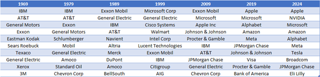 Figure 1: Largest Stocks Change Frequently Decade to Decade.
