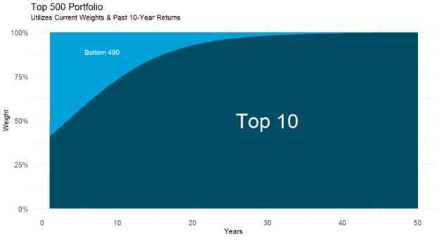 Top 500 based on the 500 largest US stocks. Chart uses current weights and past 10-year returns and applies them for 50 years into the future. Past performance does not guarantee future results. Source: Compustat. Calculation: Hartford Equity Modeling Platform.