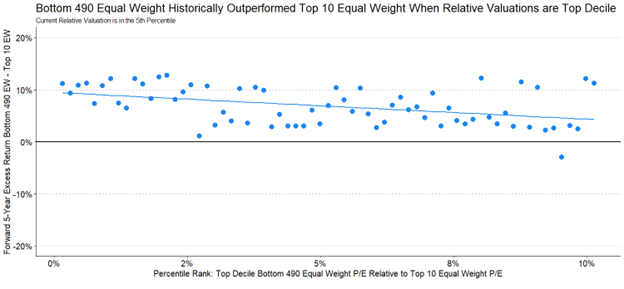When comparing historical relative valuations, based on P/E ratios of the Bottom 490 Equal Weight versus the Top 10 Equal Weight, the current relative valuation would rank in the top decile. Historically, when the Bottom 490 Equal Weight has been this discounted relative to the Top 10 Equal Weight, the Bottom 490 Equal Weight outperformed by almost 7% over the following five years, on average.