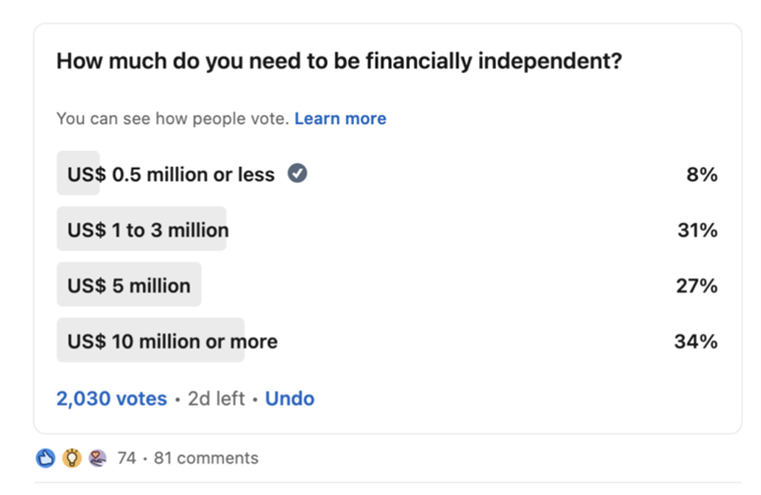 At the other end of the spectrum are those who wait too long to retire — setting ever-higher goals, afraid to leave the security or status of their careers. A LinkedIn poll I conducted showed that more than one-third of 2030 respondents believe they need at least $10 million to retire. Do we really need this much to retire?