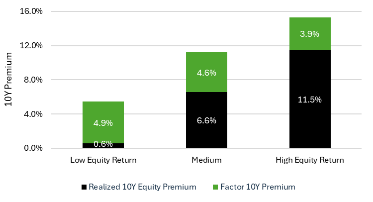 As beta weakens, alpha takes the spotlight. Factor premiums — returns from strategies like value, momentum, quality, and low volatility — perform robustly in low-return environments. Historical data (1926 to 2024) shows that when equity returns are high, factor alpha contributes 25% of total returns (3.9% of 15.4%). In weak markets, alpha’s share soars to 89% (4.9% of 5.5%), as factor premiums remain stable or rise (Figure 2).