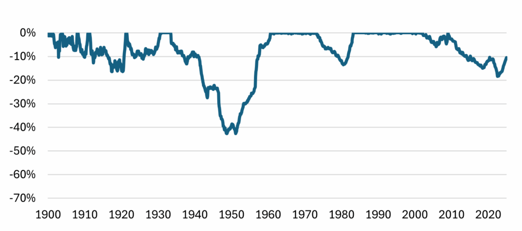 To understand this, let’s turn to history. Using US financial data from January 1900 to December 2024, we find that inflation averaged 3.0% per year.[1] This means hiding cash under the mattress would have been disastrous: over a century, one dollar eroded to less than four cents — a >96% loss in purchasing power. Inflation will eat it slowly and silently.