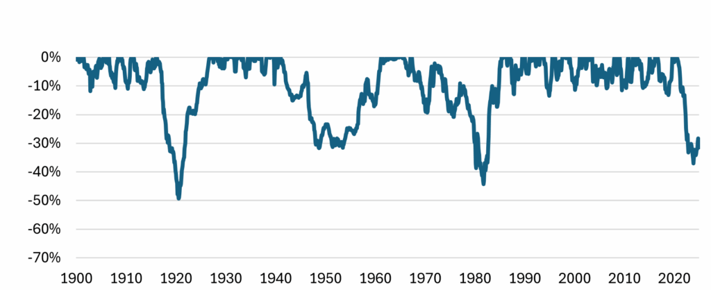 An investor is always either at an all-time high or in a drawdown. Most stock market investors are aware of this. Stocks can really disappoint in both the short-term and the long-run. The Great Depression wiped out nearly -80% of real wealth invested in the US stock market. Even after a strong recovery, it took many years, even decades, for most investors to fully heal. Not every dip is followed by a swift recovery. Inflation, often overlooked, can further erode real returns, even when stock markets go up in nominal terms.
