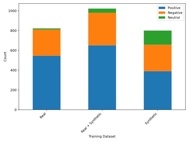 Figure 1. Distribution of sentiment classes for both real (left), synthetic (right), and augmented training dataset (middle) consisting of real and synthetic data.