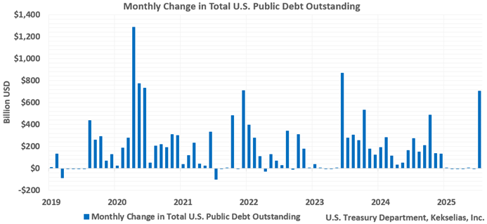 The Bank for International Settlements (BIS) estimates that inflows into stablecoins reduce 3-month T-bill yields by 2 to 2.5 basis points within 10 days, while outflows lift yields by 6 to 8 basis points in the same time period. In its report, “Stablecoins and safe asset prices,” BIS notes that stablecoins pegged to the US dollar and backed by T-bills increasingly resemble money market funds. After the $5 trillion debt ceiling hike increased T-bill issuance, stablecoins’ contribution toward absorbing upsized ($100 billion) weekly 4-week T-bill issuance has underscored cryptocurrencies’ role as funding provider for US federal expenditure, especially when total US public debt outstanding surged $700 billion in the month of July 2025 (Figure 1).