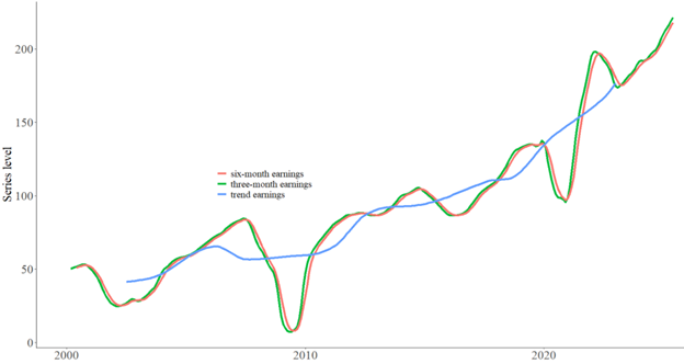 Chart 1. 3-month, 6-month, and trend earnings, 2000:1 to 2025:6.