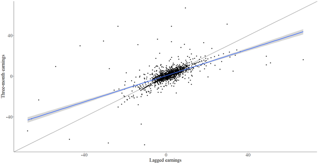 And at the risk of estimating the obvious, the R-squared of a model explaining 12-month earnings with six-month earnings (from six-months before) is 0.699, whereas including three-month earnings (from three-months before) improves the fit to 0.953.