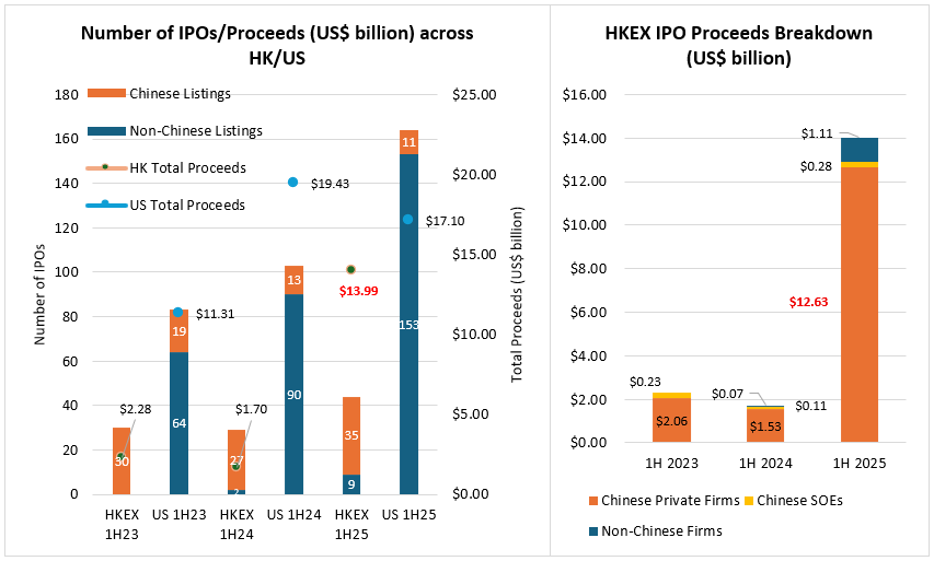 Mainland China is a policy-driven economy. In 2024, the China Securities Regulatory Commission (CSRC) tightened IPO approvals, especially for unprofitable or early-stage firms. As a result, onshore fundraising collapsed to $9.3 billion across 101 IPOs, down 83% year over year. In the first half of 2025, mainland exchanges raised only $4.7 billion, less than one-third of what companies listed on HKEX raised in the same period.