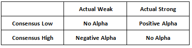 The purpose of actively investing in equities is to generate a positive return above what you could have earned simply by investing in the market, or alpha. Earning alpha is accomplished by capitalizing on situations in which the market has incorrectly predicted the outcome of events, not by generating a list of companies that the market already has high expectations for. The fact that the market already believes that a particular company is expected to grow 40% and trades at a 10x P/E multiple gives you no edge in generating excess returns over the market. The following figure generalizes the different outcomes achieved given low/high consensus expectations versus weak/strong actual results. As can be seen, it is difficult to generate positive alpha by screening for companies with strong consensus expectations.