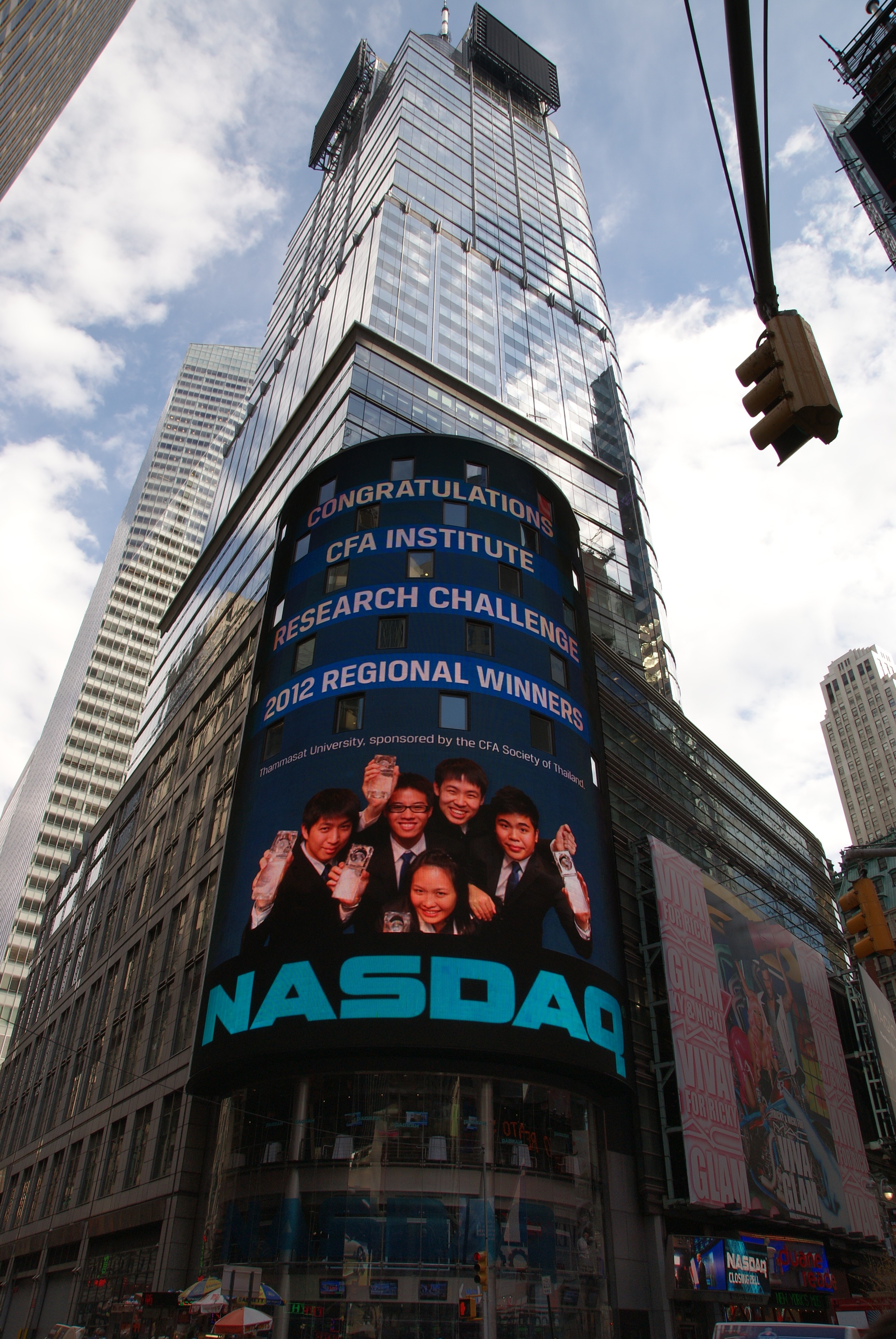 7-story NASDAQ MarketSite sign on Times Square congratulates the CFA Institute Research Challenge winning team from Thammasat University.