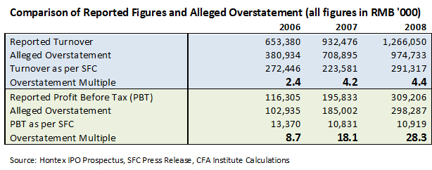 As can be seen in the above comparison, the alleged overstatement of its financial status by Hontex at the time of the public offering was a multiple of actual values. Profit before taxes, for example — a widely used figure by financial analysts for corporate valuations — was allegedly overstated by a factor of over 28 in 2008.