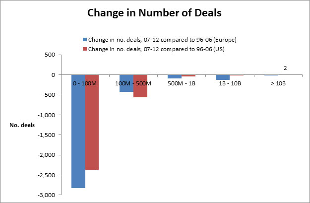 But behind the big picture, the distribution of deals by offer size reveals a more interesting phenomenon. The chart below shows the percentage change in average deal values for the period 2007-2012 compared to average deal values for the preceding 10 years. The chart illustrates that average deal values have fallen markedly in Europe across all offer-size categories. In the U.S., deal sizes have exhibited similar declines for all but the largest offer-size category (> S10 billion), which exhibits a huge increase, although this is likely attributable to the occurrence of a few mega-cap companies listing in recent years (such as the Facebook offering). But a more troubling trend is revealed in the number of deals taking place within each offer size category, shown in the subsequent chart. While there is little change in the number of large cap deals, the number of smaller deals (offer sizes less than $500 million) has declined dramatically in both Europe and the U.S.