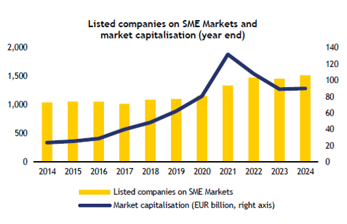 First, unlike in most other major advanced countries, primary equity market activity in the EU saw a sharp decline in 2025. A new assessment by industry body AFME suggests that in the first half of the year, EU IPOs fell to their lowest level since 2012. In three EU countries (Romania, Hungary, and Estonia), enterprises did not make use of market finance at all. As the chart below shows, equity markets dedicated to small and medium-sized enterprises (SMEs) finance (so-called junior markets) have seen a drop in capitalization and stagnating numbers of listed companies.
